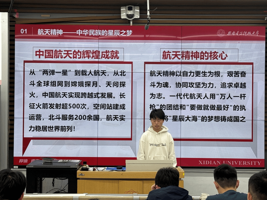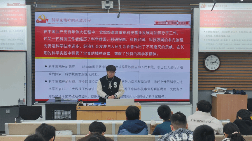 研究生邱安豪以“仰望星空,脚踏实地——钱学森的航天报国路”为主题进行分享。通过详实的历史资料,他生动讲述了钱学森突破重重阻碍毅然回国、带领科研团队在艰苦条件下开创中国航天事业的感人经历。邱安豪讲到,钱学森等老一辈科学家所展现的“热爱祖国、无私奉献、自力更生、大力协同”的航天精神,是激励当代科技工作者砥砺前行的宝贵财富。他谈到,这种精神对于从事空间科学研究的青年学子具有特殊意义,鼓励同学们要将个人理想与国家航天事业发展紧密结合。