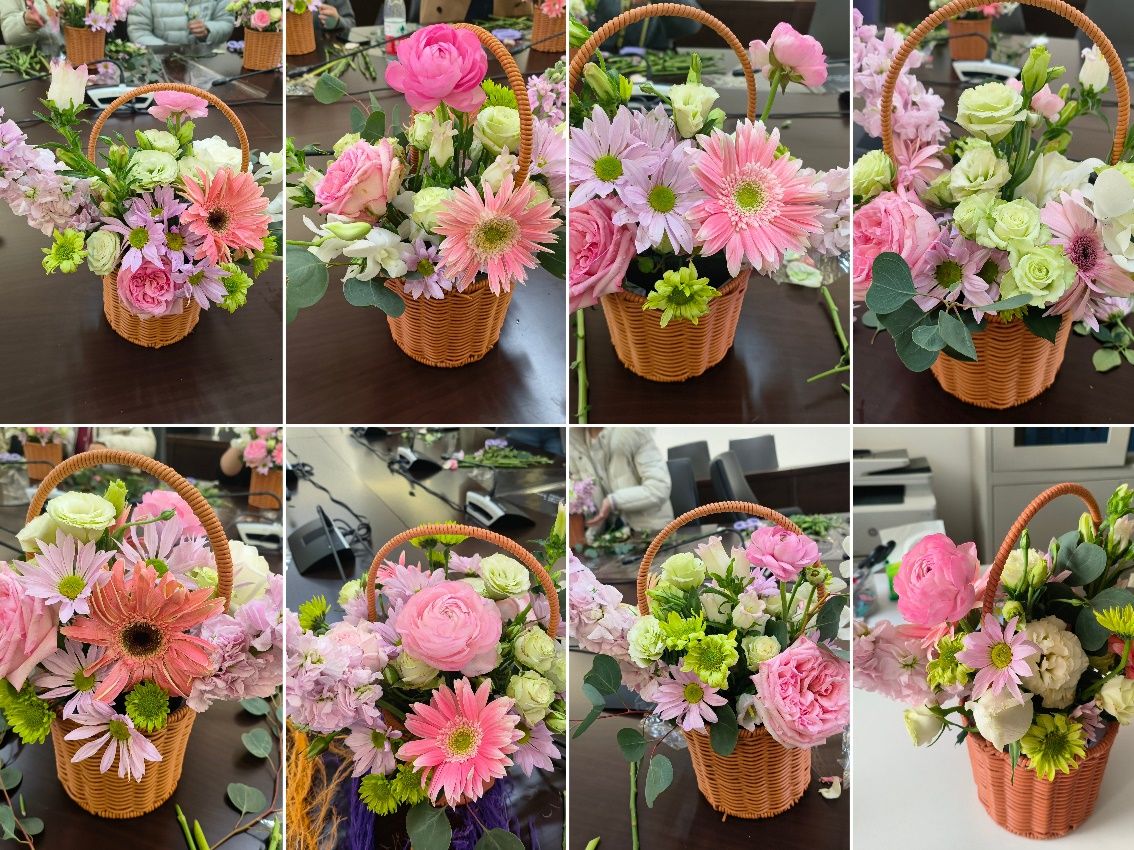 特邀花艺师现场讲授插花艺术,围绕花材识别、色彩搭配、造型设计及养护常识等内容进行了详细讲解与实操演示。大家认真聆听,跃跃欲试,在动手环节中兴致勃勃地修剪花枝、设计层次、搭配色彩,将普通花材化为一件件独具匠心的花艺作品。一个个花篮疏密有致、生机盎然,承载着大家对美的追求与对生活的热爱。大家对自己的作品爱不释手,纷纷拿出手机记录美好时刻。