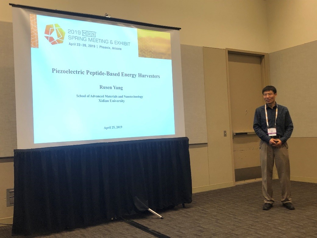 当地时间4月22日,材料科学领域顶级国际学术会议——美国材料研究学会(Materials Research Society)2019年度春季会议在美国菲尼克斯召开,杨如森应邀在大会上作了题为“Piezoelectric Peptide-Based Energy Harvesters”的特邀报告。报告会上,杨如森利用本次珍贵的展示机会,向与会人员介绍了金沙娱乐城