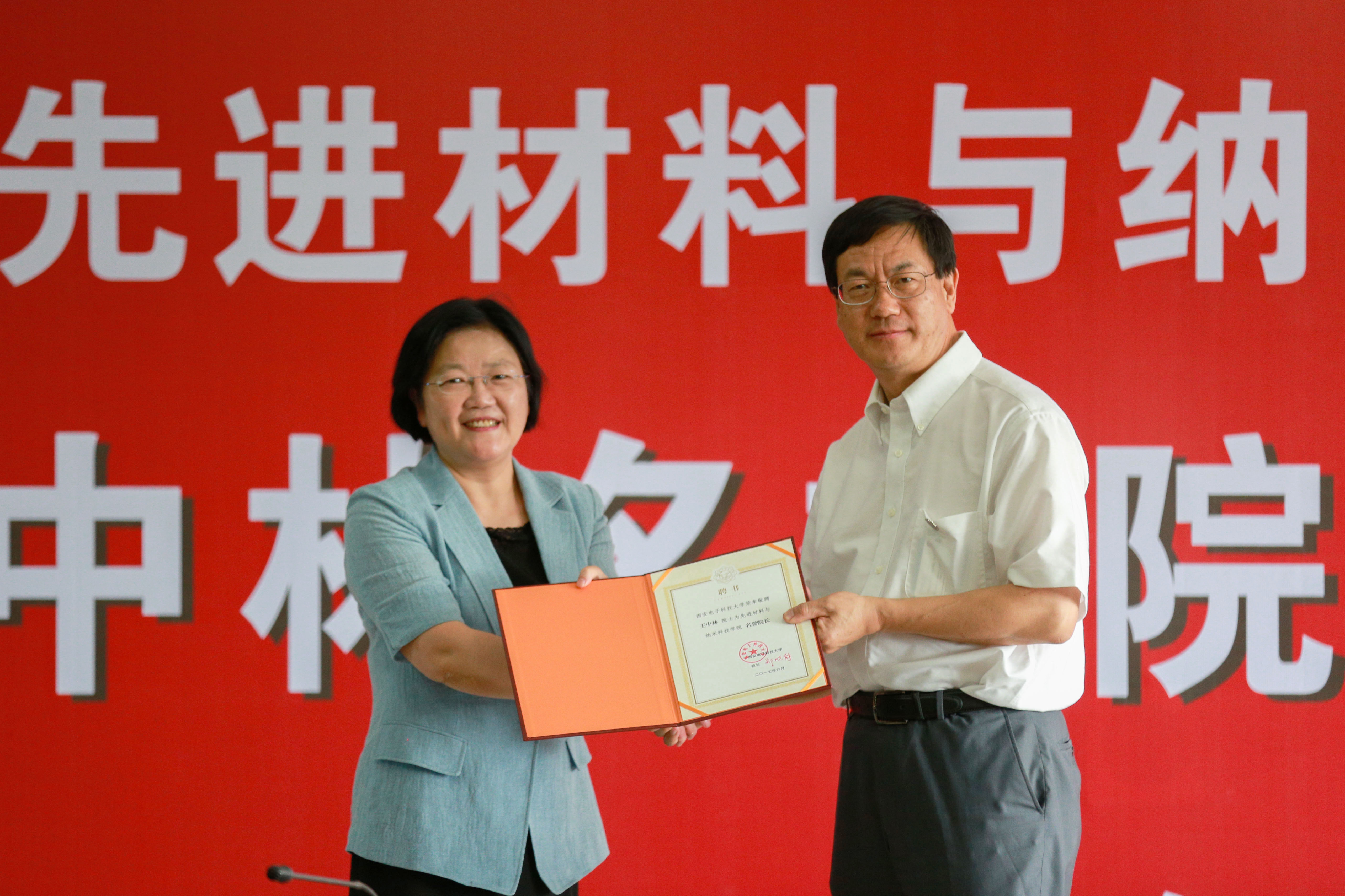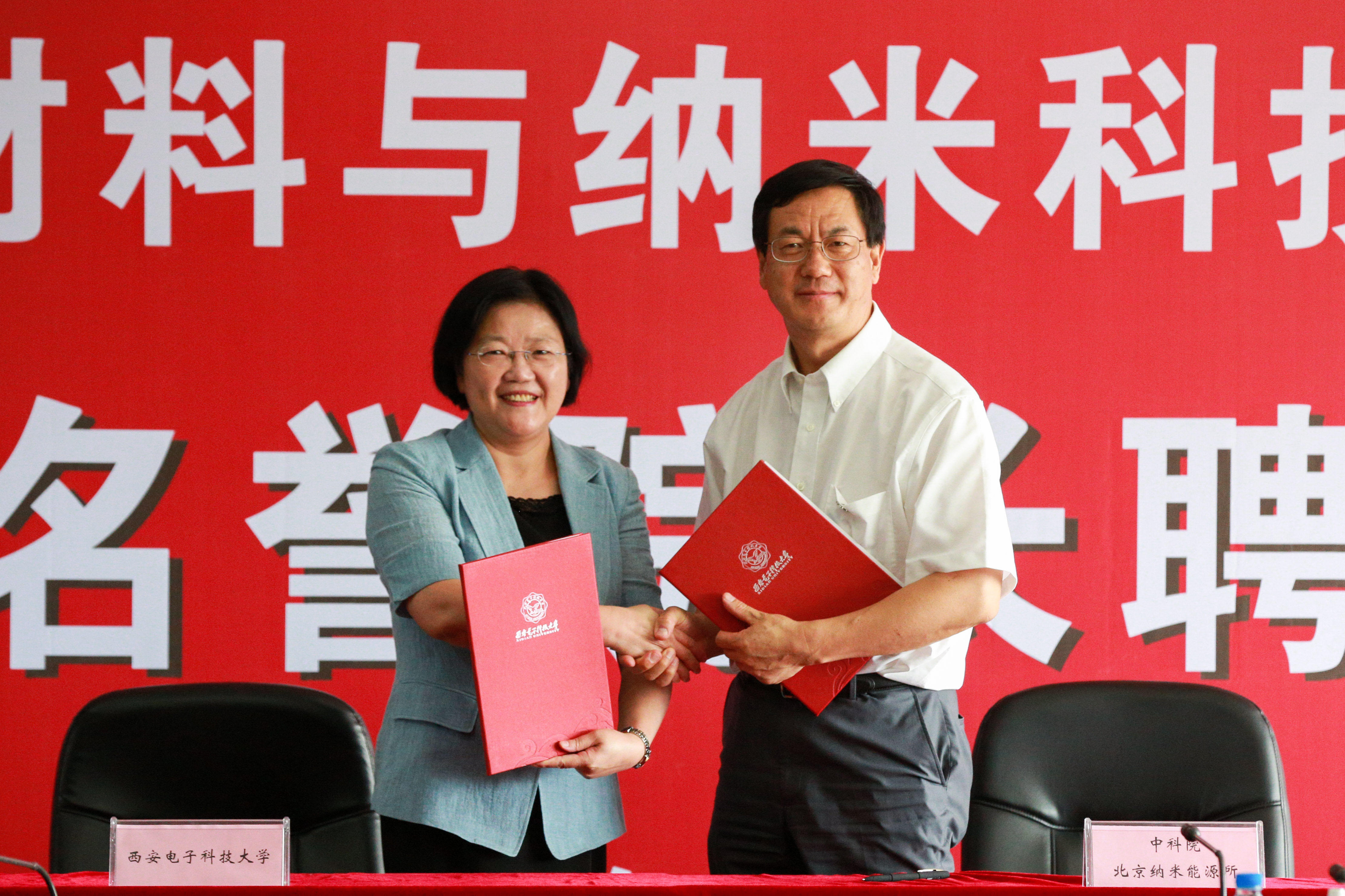 名誉院长、首席科学家、学术委员会主任的聘任文件。郑晓静为王中林佩戴校徽并颁发聘书。
