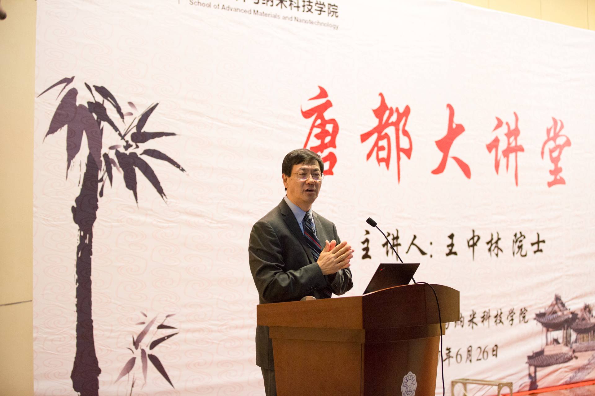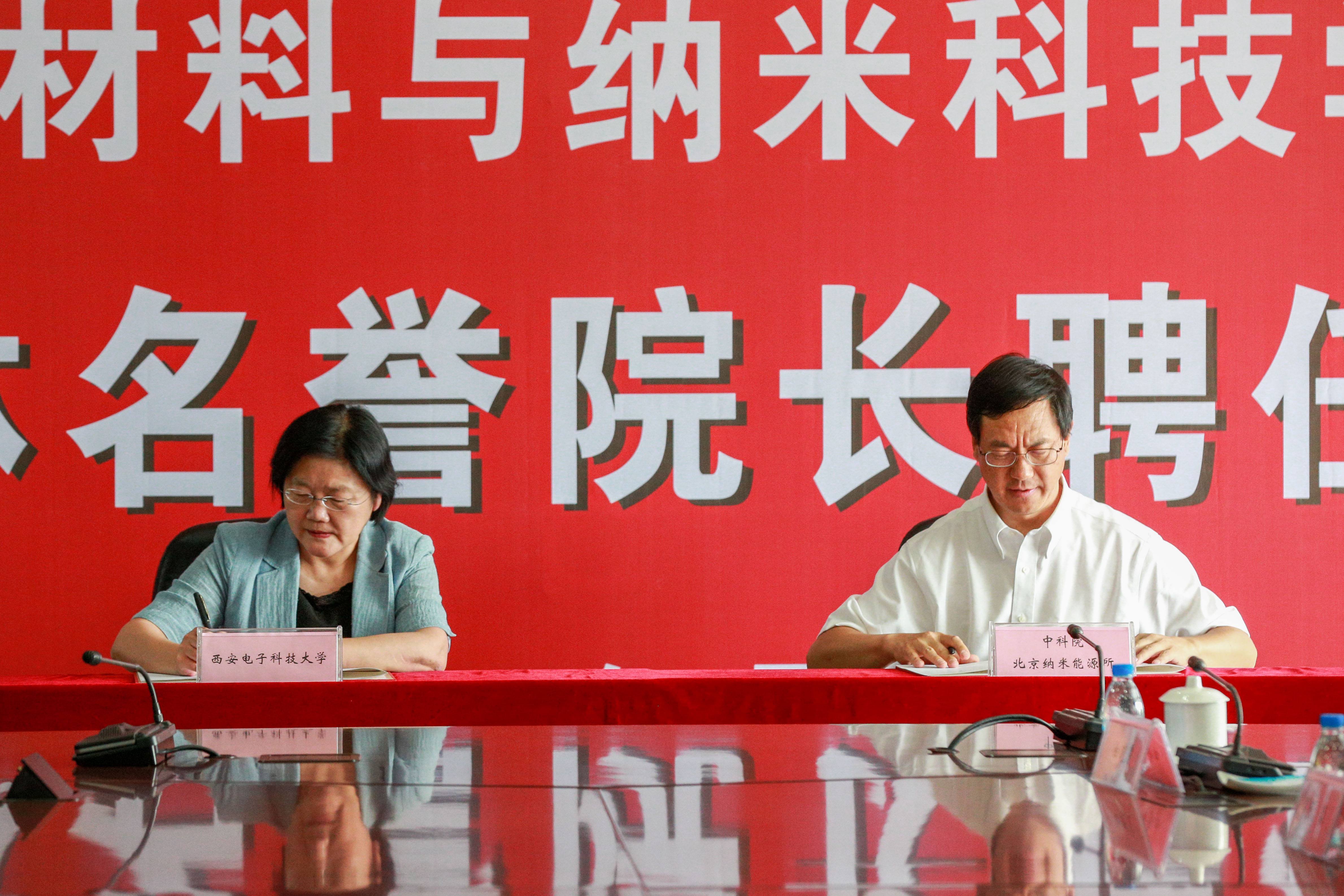 名誉院长、首席科学家、学术委员会主任授聘仪式。党委书记、校长郑晓静院士出席会议。副校长郝跃院士宣读了对王中林的聘任文件。郑晓静为王中林佩戴校徽并颁发聘书。