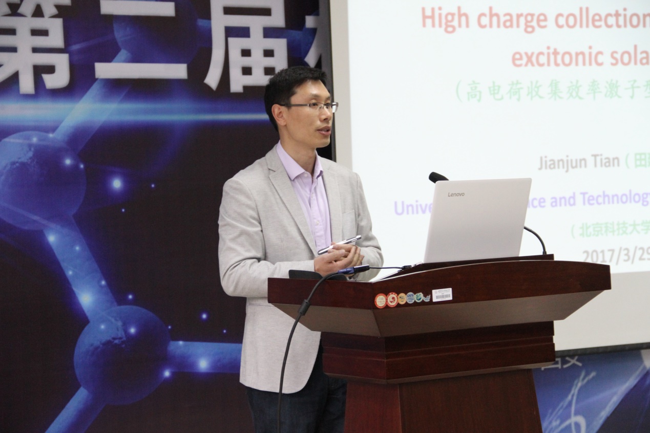 首先,田建军教授介绍了激子型太阳能电池的分类,包括DSSC,QDSSC以及钙钛矿太阳能电池。接着,结合文献以及他们的研究经验,由浅入深的为与会师生介绍了目前激子型太阳能电池的效率远远低于理论值的原因:电荷的收集效率。他讲到,量子点上存在较多的缺陷,导致电荷收集效率受限,进而使得开路电压较低。为了解决这个科学问题,田教授及其团队通过高质量活性层的制备,界面修饰以及离子掺杂三个方面开展了一系列有影响力的科研工作。随后,田教授向我们介绍了在高效量子点敏化太阳能电池以及高效稳定钙钛矿太阳能电池方面的研究成果。通过对这些工作内容的介绍,使得在场师生对目前激子型太阳能电池仍然存在的问题,未来的研究方向以及钛矿和量子点太阳能电池的有了更清晰和深入的认识。