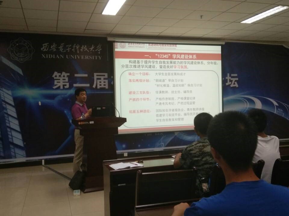 的研究方向入手,结合物理化学领域的诺贝尔奖成果,逐步将同学们引入奥妙的科学世界,唤起新生们浓厚的专业兴趣。李培咸从半导体照明、微波功率材料与器件、纳米材料与低维材料、敏感材料与器件与新型电池相关材料等五个研究领域做了清晰扼要的介绍,还与同学一起探讨了“光”的奥秘与应用,并展开了良好的互动交流,为同学们展现了科学的神奇与魅力。李培咸风趣生动的讲解不仅使同学们对专业研究有了深入的认识,也对自己接下来的大学生涯充满了信心。然后,李培咸用更加情怀的方式为新生的大学生涯及人生发展提供了建议。从三个“什么”、四个“学会”入手,引导新生如何学习、做人、做事及与人相处,诠释了成功的路上不仅需要方向、梦想、高度,更需要坚持、合作、充实完善自我,以实现人生的强大,强大到让自己平静与善良,实现真正意义的成功。