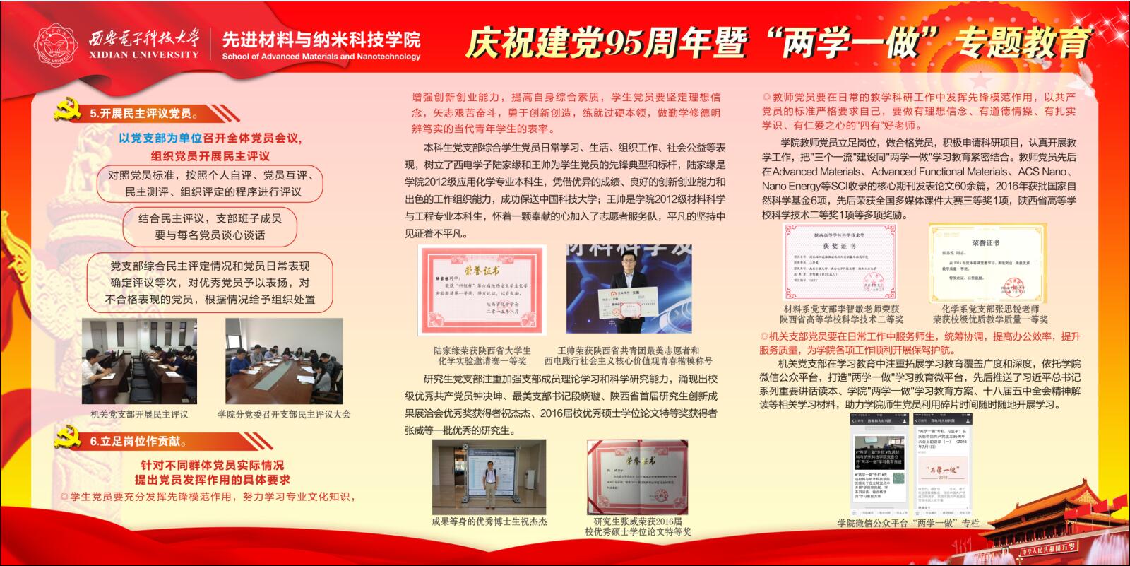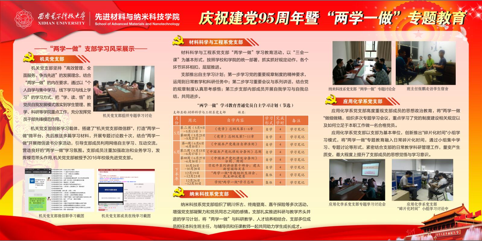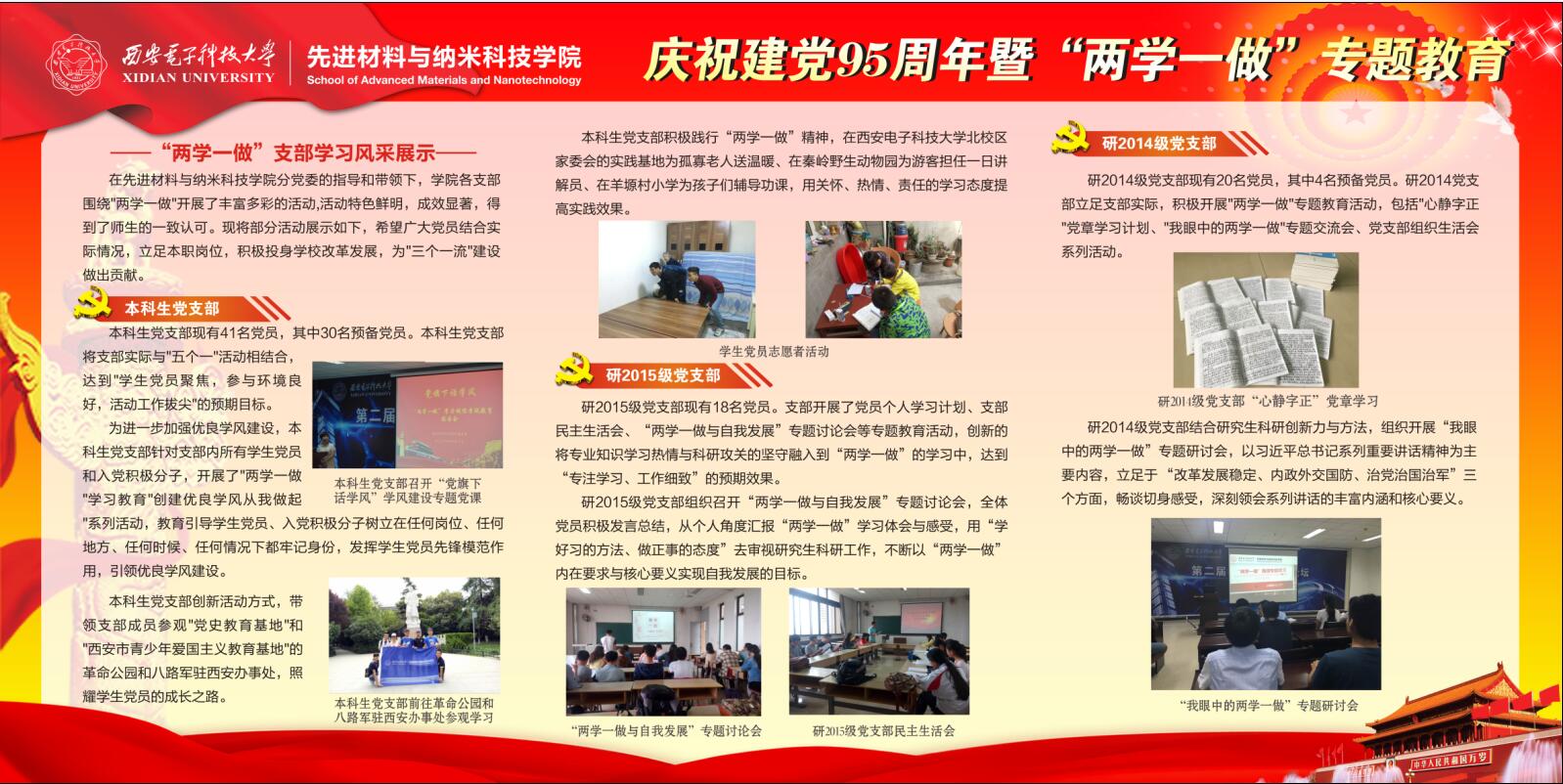 (通讯员 钟决坤 卢琳)为落实“两学一做”学习教育精神,充分发挥党员先锋模范作用,浓郁金沙娱乐城 学习氛围,2016年9月,金沙娱乐城 在G楼一层大厅金沙娱乐城 文化展示区推出庆祝建党95周年暨“两学一做”教育专题展示。 金沙娱乐城 积极开展“学党章党规、学系列讲话,做合格党员”学习教育活动,在金沙娱乐城 分党委的指导和带领下,各支部以“两学一做”为中心开展了丰富多彩的学习教育活动,特色鲜明,成效显著。本次展示主要以展板的形式体现,紧紧围绕“两学一做”的核心教育内容、金沙娱乐城 学习教育方案、各支部创意活动等内容,采用文字、图片和图表相结合的方式,全面、凝练且清晰的展示了“如何学、怎么做”,金沙娱乐城 特色教育活动以及各支部将“两学一做”融入学习、教学、科研、管理等方面的风采。希望广大党员结合实际情况,立足本职岗位,积极投身金沙娱乐城 改革发展,为“三个一流”建设做出贡献。(完)
