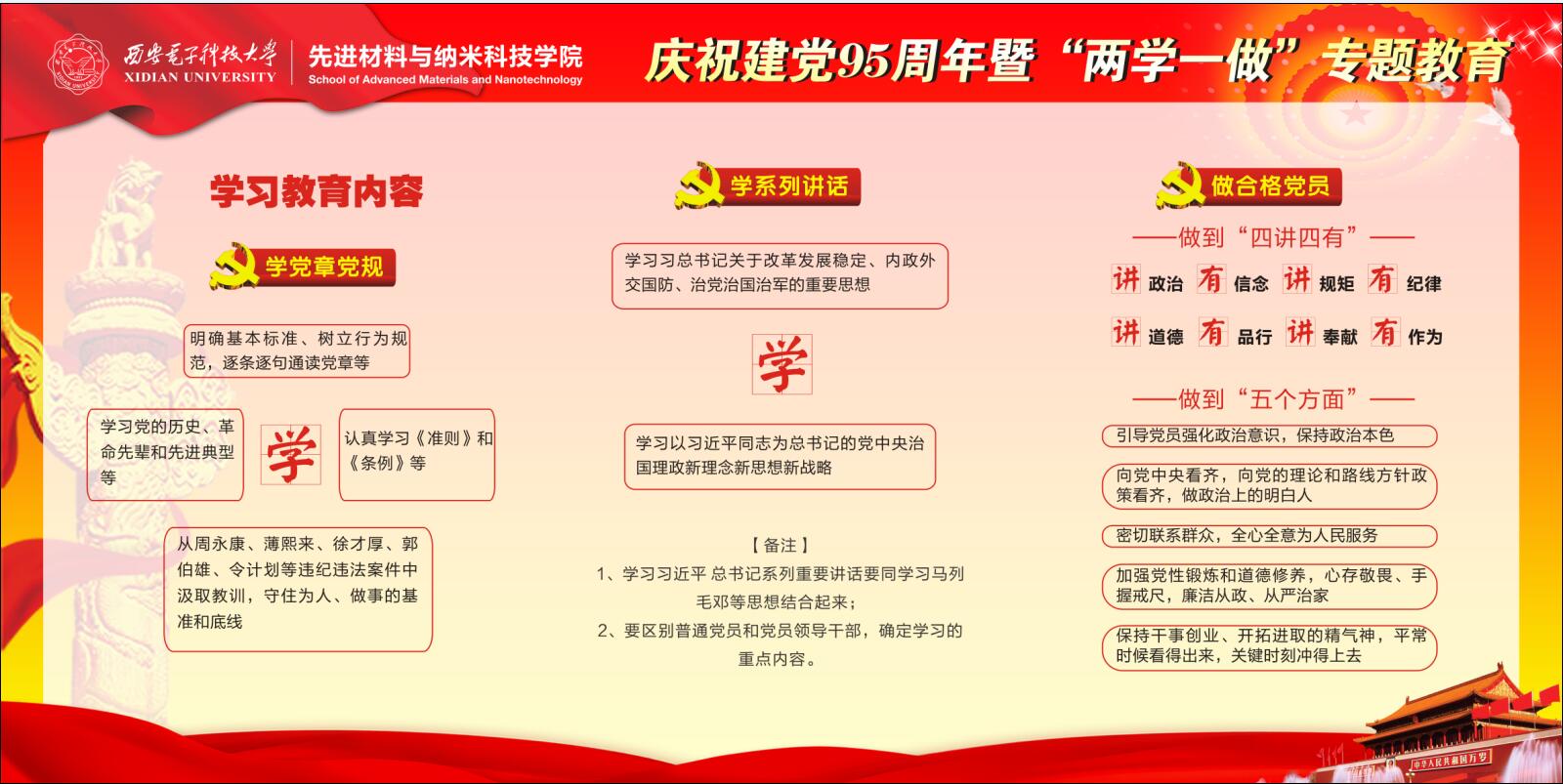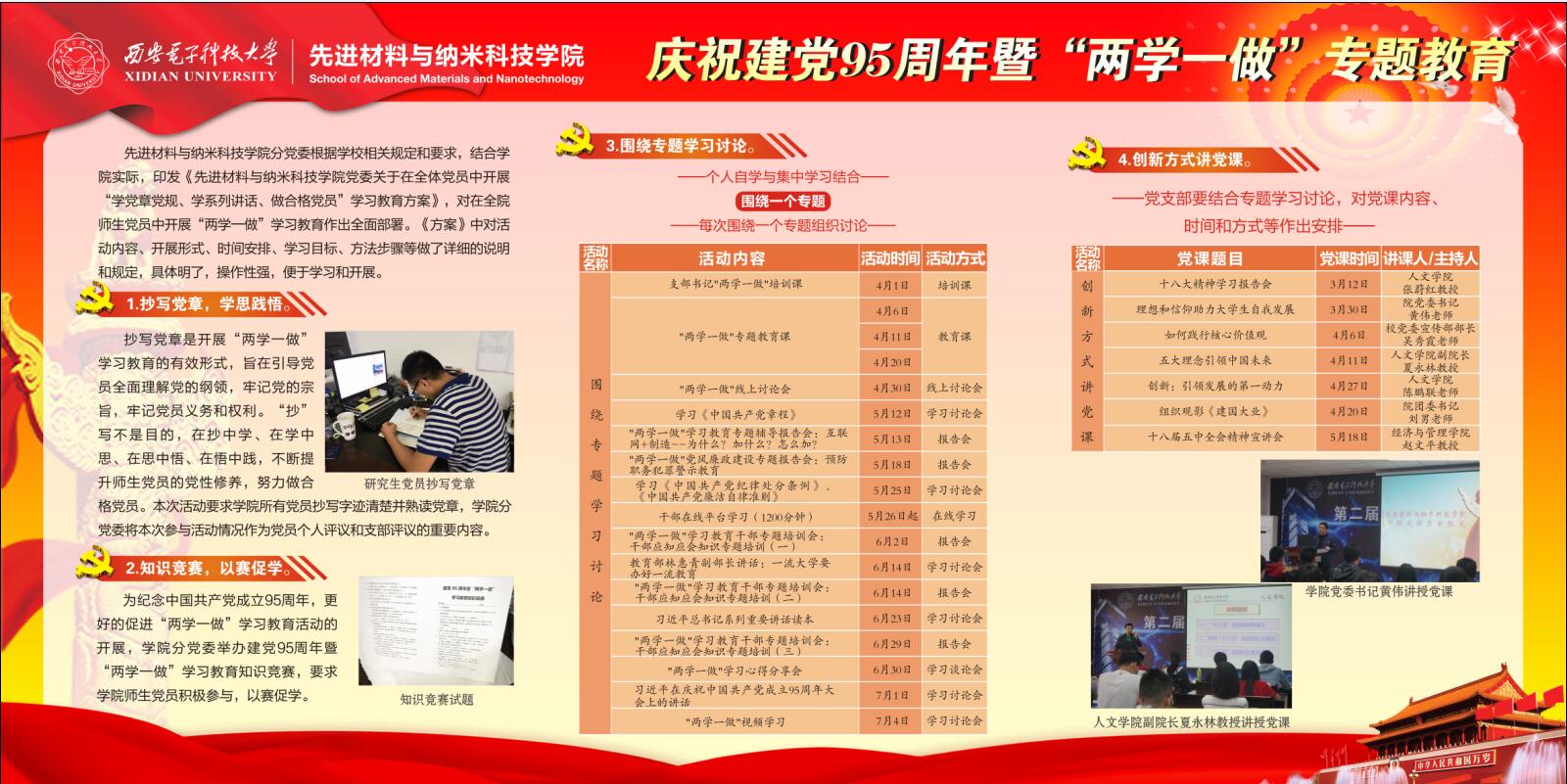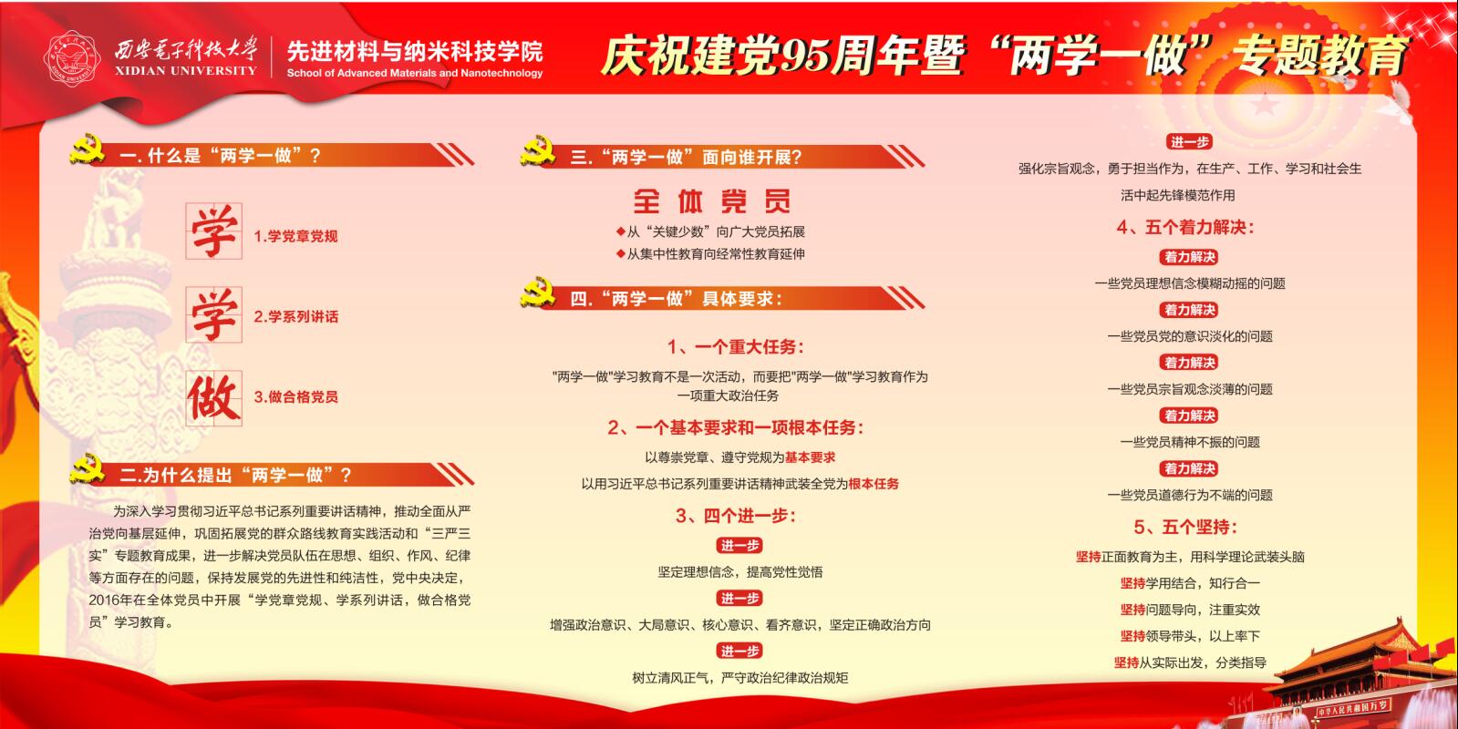 (通讯员 钟决坤 卢琳)为落实“两学一做”学习教育精神,充分发挥党员先锋模范作用,浓郁金沙娱乐城 学习氛围,2016年9月,金沙娱乐城 在G楼一层大厅金沙娱乐城 文化展示区推出庆祝建党95周年暨“两学一做”教育专题展示。 金沙娱乐城 积极开展“学党章党规、学系列讲话,做合格党员”学习教育活动,在金沙娱乐城 分党委的指导和带领下,各支部以“两学一做”为中心开展了丰富多彩的学习教育活动,特色鲜明,成效显著。本次展示主要以展板的形式体现,紧紧围绕“两学一做”的核心教育内容、金沙娱乐城 学习教育方案、各支部创意活动等内容,采用文字、图片和图表相结合的方式,全面、凝练且清晰的展示了“如何学、怎么做”,金沙娱乐城 特色教育活动以及各支部将“两学一做”融入学习、教学、科研、管理等方面的风采。希望广大党员结合实际情况,立足本职岗位,积极投身金沙娱乐城 改革发展,为“三个一流”建设做出贡献。(完)