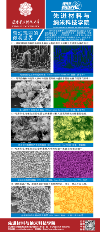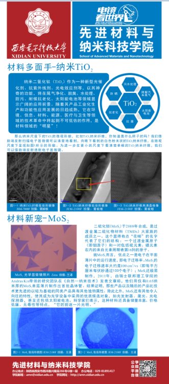 本期展板涵盖“蓝光LED照亮世界”、“材料多面手TiO2”、“材料新宠MoS2”、“奇幻瑰丽的微观世界”、“先进材料与纳米科技研究中心介绍”等5个模块内容,通过展示教师和学生日常研究工作中所拍摄的生动有趣的GaN薄膜、TiO2纳米纤维以及MoS2透射电镜和扫描电镜系列图片,向新生全面传递了金沙娱乐城材料院的专业特色,即依托金沙娱乐城