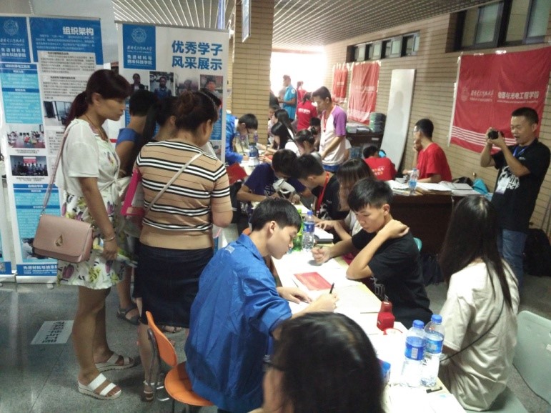 报到,接待点、实验室和见面会之间学生和家长往来匆忙,新生报到工作有序进行。