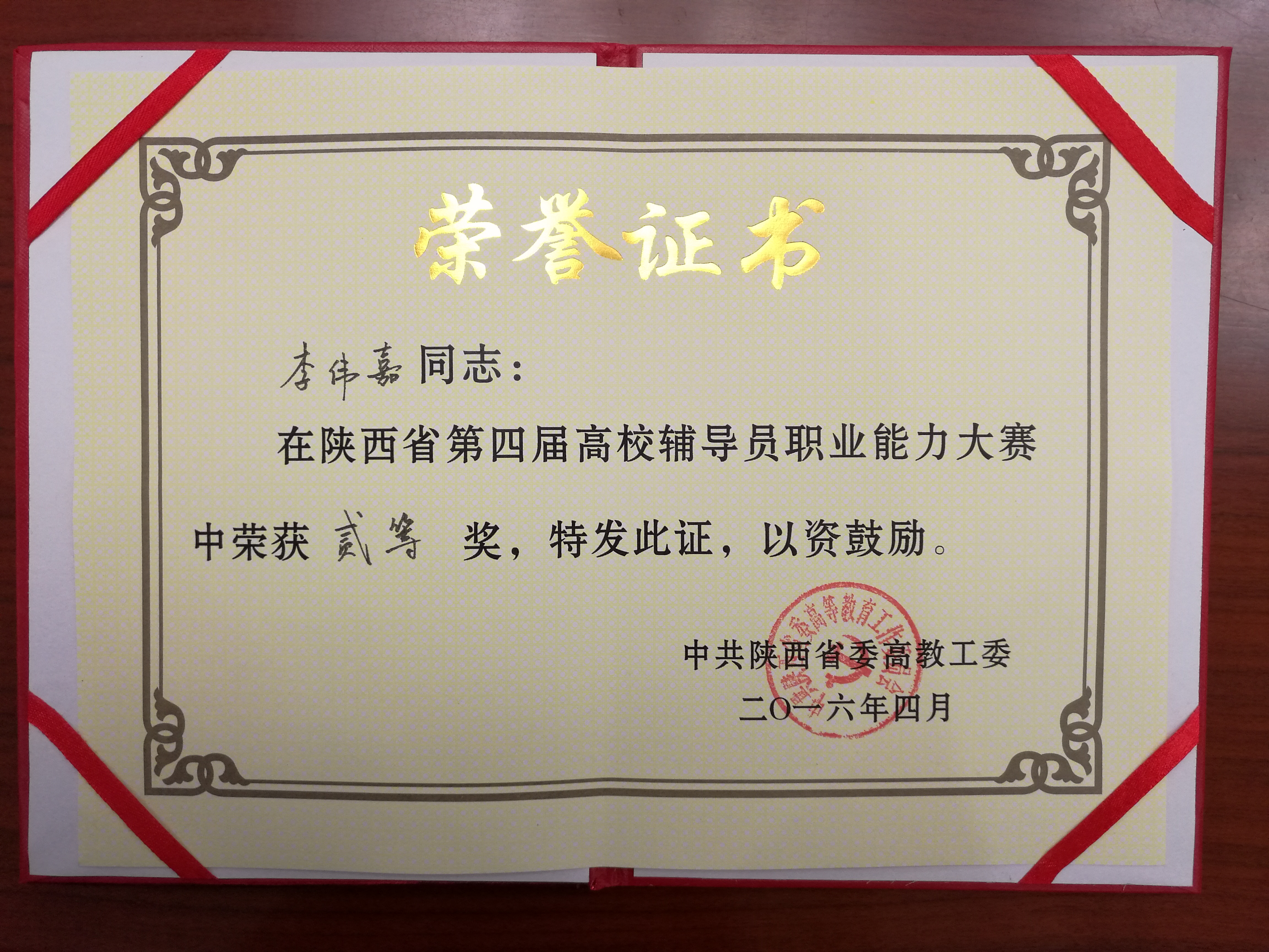 辅导员李伟嘉,于2016年4月,在陕西省第四届高校辅导员职业能力大赛中斩获二等奖殊荣,特此祝贺!