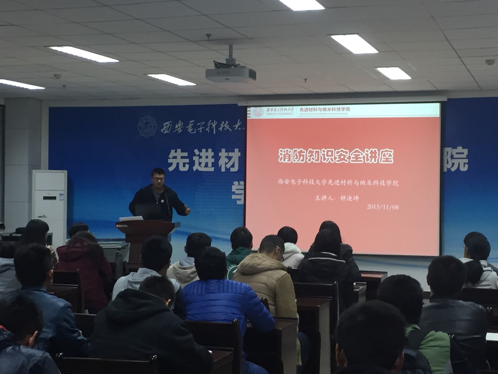 在G楼118举办了“消防安全教育”讲座。15级新生辅导员钟决坤主持,全体本科新生参加了此次讲座。