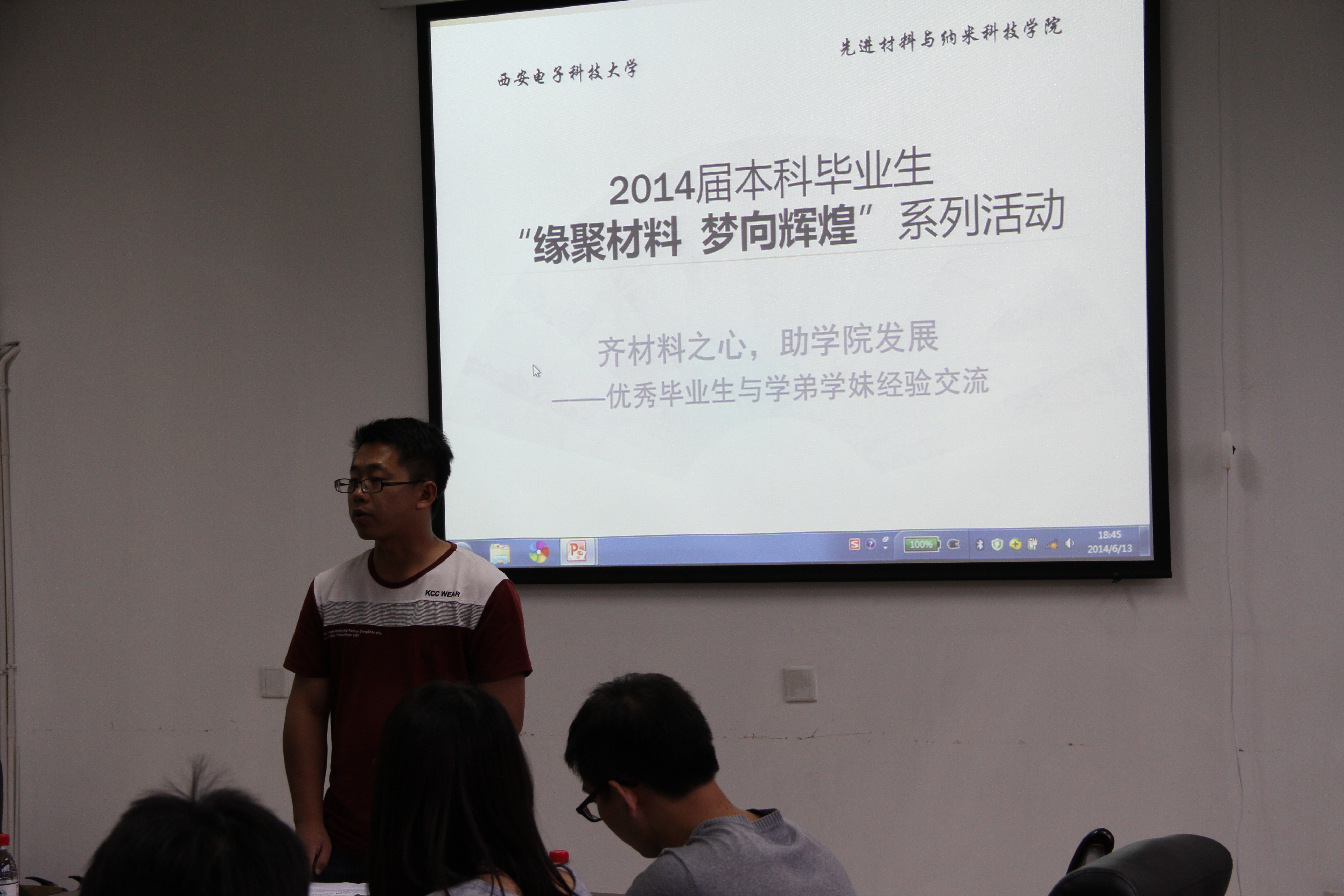 交流会于19点正式开始,材料院材料专业和化学专业共五位学长学姐出席了本次交流会。首先接受同学们提问的是材料专业的刘珏学姐,她在大学期间曾获得国家奖学金一次,校级奖学金若干次,并在大四上学期选择留学至美国宾夕法尼亚大学。她在回答学弟学妹们关于出国深造的问题时提到:一个人保持清醒的头脑是在留学道路上一个重要的素质,我们的本科生不能将出国留学当作神圣的、高不可攀的活动,而是当作自己开阔眼界、增长见识的途径,并时刻保持自己为国争光,报效祖国的信念。应用化学专业保送浙江大学的王虎学长曾数次获得“优秀学生标兵”的称号。他从生活、读研和大学生兼职三方面对学弟学妹们提出了自己的宝贵意见。他认为,必须看清楚上研或工作的本质,读研其实也是另一种工作平台或者说是另一种工作环境,要在为自己上研的奋斗过程中找准自己的目标和关注点,时刻提醒自己努力奋斗。随后,王虎学长分享了自己参加浙江大学夏令营的经历和经验。随着交流会的进行,材料院保送中科院半导体所研究生的陈光灿学长、竞赛达人沈海明学长和工作标兵张攀豪学长分别分享了自己的大学生活心得体会。