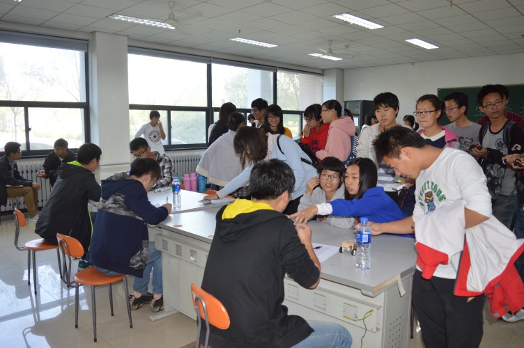 院赛过程中,由科协竞赛部成员负责为参赛作品贴上标签,然后参赛选手带上自己的作品由评委们鉴定。选手们井然有序地将自己的作品展示给评委,并讲解自己制作作品的目的,作品的构造及原理,评委们认真倾听选手们的讲解并一一给出意见,并指导选手们如何更好地完善自己的作品,选手们悉心听取经验,拓展自己的经验及科技知识。院赛场面热闹非凡,选手与选手间亦是相互交流,相互学习,共同进步。院赛涌现出了一系列优秀作品。