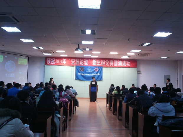 辩论队在大学生活动中心511展开“宏辞论道”新生辩论赛半决赛的角逐。西安外国语大学、西北政法大学以及金沙娱乐城