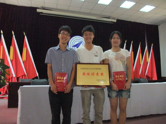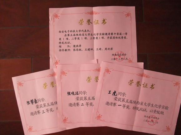 8月20日至22日,由陕西省化学会、陕西省高等金沙娱乐城 化学实验教学中心联席会主办,西北工业大学承办的陕西省第五届大学生化学实验邀请赛近日在西北工业大学举行。金沙娱乐城 应用化学系选派三位学生组队参赛,经过理论笔试和实验操作两个环节的比拼,金沙娱乐城 代表队荣获个人成绩一等奖1项,二等奖1项,三等奖1项,并获得“团队优秀奖”。