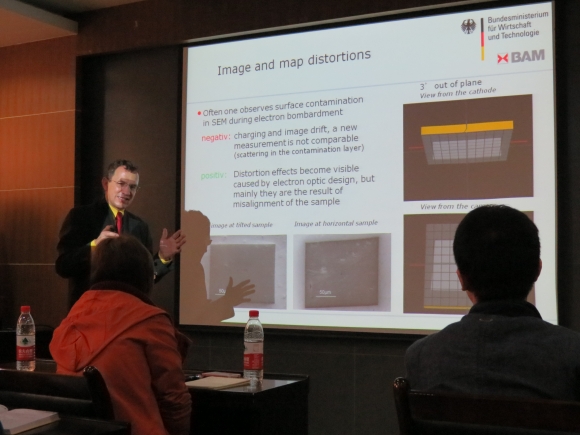 金沙娱乐城新闻网讯(通讯员 史学芳)应金沙娱乐城 材料分析实验室的邀请,德国联邦材料研究与测试研究所(BAM)晶体学家Dr. Gert Nolze于2013年10月25至26日来金沙娱乐城进行学术交流访问。10月25日上午,Gert Nolze博士在西大楼四楼会议室为广大师生做了题为“EBSD fundamentals and challenges in the investigation of semiconductor materials”的学术报告,会议由金沙娱乐城 筹备小组马晓华教授主持。 EBSD (Electron Back-Scattered Diffraction)是对材料进行微区相分析的一种重要方法,在金属、合金、陶瓷以及半导体材料的研究中已经得到了广泛应用。Dr. Gert Nolze简要介绍了EBSD技术,详细列举了很多自己多年来在多种材料研究领域应用的经典实例,并耐心回答了同学们的问题。学术报告内容翔实,题材新颖,开阔了师生们的学术视野,受到大家的热烈欢迎。 25日下午,Dr. Gert Nolze在材料分析实验室,对石墨烯生长衬底材料的EBSD测试分析进行了具体应用指导,探讨了这项技术在多种半导体材料表征分析中的测试方法、制样技巧以及测试分析条件的优化等问题。 Dr. Gert Nolze是一位晶体学家,现在联邦德国材料研究与测试研究所工作,是“扫描电镜中材料的局部相分析及微观结构表征”研究组的负责人。Dr. Gert Nolze 在Leipzig University读博士学位时主修晶体学,其博士论文是“利用kossel衍射对非中心对称晶体的系统表征”。 1990年开始至今,他在德国联邦材料研究与测试研究所工作,工作之余,他还发明了PowderCell软件,这是一个x-射线衍射模拟的免费软件,至今还是研究领域中浏览并下载次数最多的软件之一。2000年开始,其研究方向转向EBSD,主要研究课题“扫描电镜中微观结构的EBSD表征”获得了德国的研究基金。作为德国EBSD的发起人及负责人,每年他都组织德国的EBSD年会,年会的主要方向是对EBSD的方法进行讨论,并为从事EBSD工作的技术员及工程师提供互相交流经验及信息的平台。目前其主要研究方向为如何对EBSD分析技术进行简单化以及探索EBSD新方法等方面。