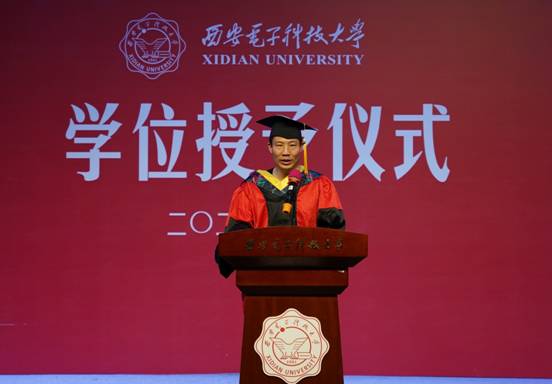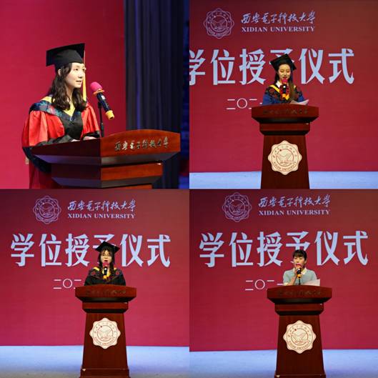 姚梦媛代表硕士毕业生发言。她向老师们几年来对同学们的传道授业,指点迷津,包容呵护表达了最诚挚的谢意,也表达了他们必将在伟大时代赐予青年的恢弘舞台上披荆斩棘,踔厉风发,扬帆起航的豪情壮志。