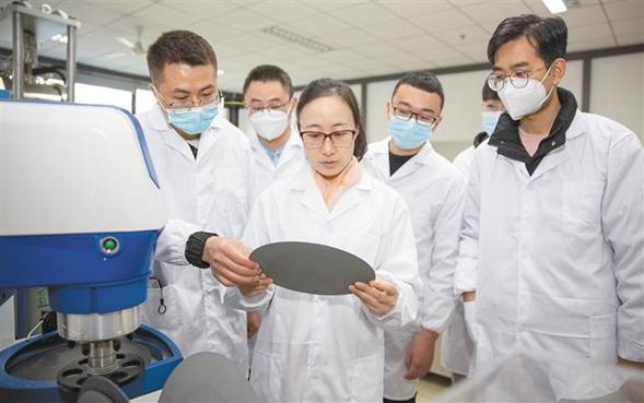 11月15日,杨丽(左三)在实验室与团队成员进行技术探讨。