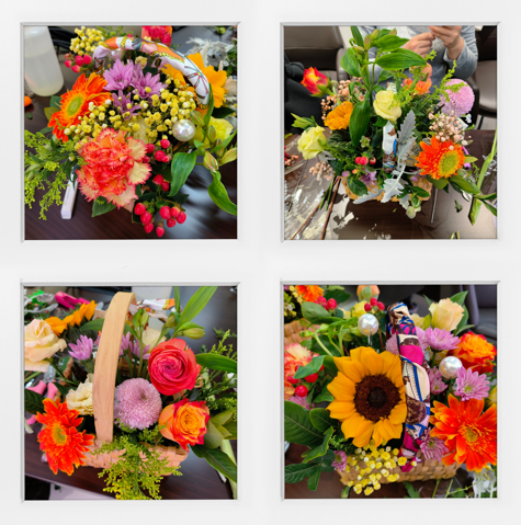 特邀独立花艺设计师思思老师进行指导,讲授了花材、修剪、配色、造型等花艺知识技巧。在老师的指导下,大家边看边学,边交流边探讨,充分发挥想象力,用自己灵巧的双手,将向日葵、康乃馨、小雏菊、满天星等多种花材有层次地搭配在一起,完成了一件件精美的作品,是对节日的祝福,也是对美好生活的向往。