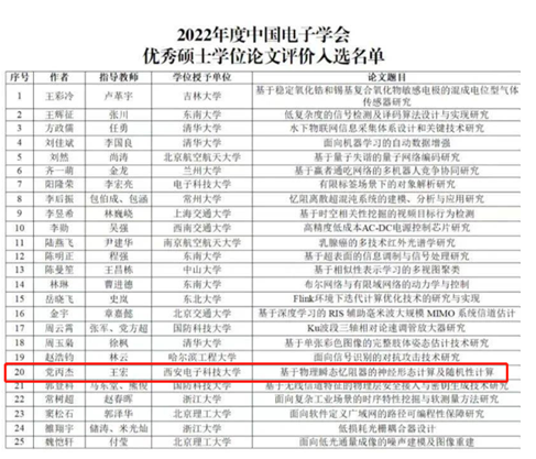 学子再获佳绩。2017级博士研究生刘书海(导师:秦勇教授)题为《高性能压电电子学器件》的学位论文获评“陕西省优秀博士学位论文”;2017级硕士研究生党丙杰(导师:王宏教授)题为《基予物理瞬态忆阻器的神经形态计算及随机性计算》的学位论文获评“中国电子学会优秀硕士学位论文”(本年度全校唯一)。