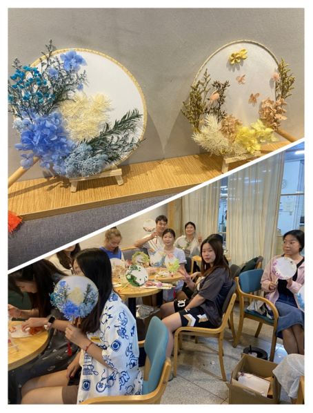 新裂齐纨素,皎洁如霜雪,裁为欢喜扇,团团似明月。同学们即兴而起,充分发挥自己的创意和想象力,在心中进行简单的扇面构图,对永生花进行修剪、拼接处理,一一粘贴点缀在空白团扇上,有的黄白相嵌,有的粉蓝相映,朵朵芳菲绽放于轻罗小扇,声声笑语弥散在整个活动现场。