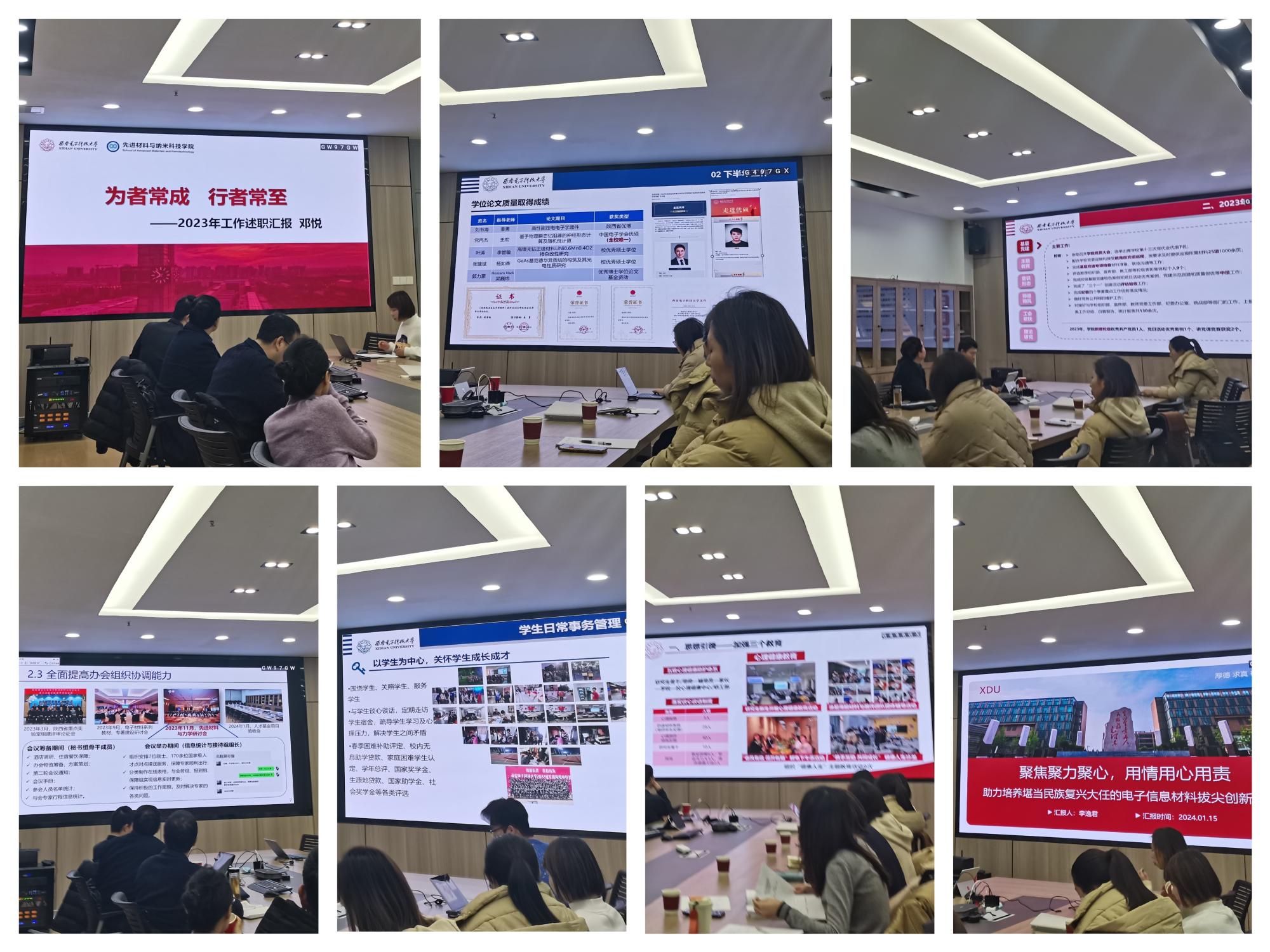 在G-142举行2023年度教职工述职考核工作会,材料系、化学系、纳米系、智能所、院机关等90余名教职工分5组开展述职汇报交流。金沙娱乐城