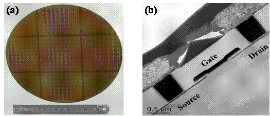 3  (a) 8英寸氧化铪基铁电薄膜照片; (b) 后栅极工艺制备铁电存储单元照片