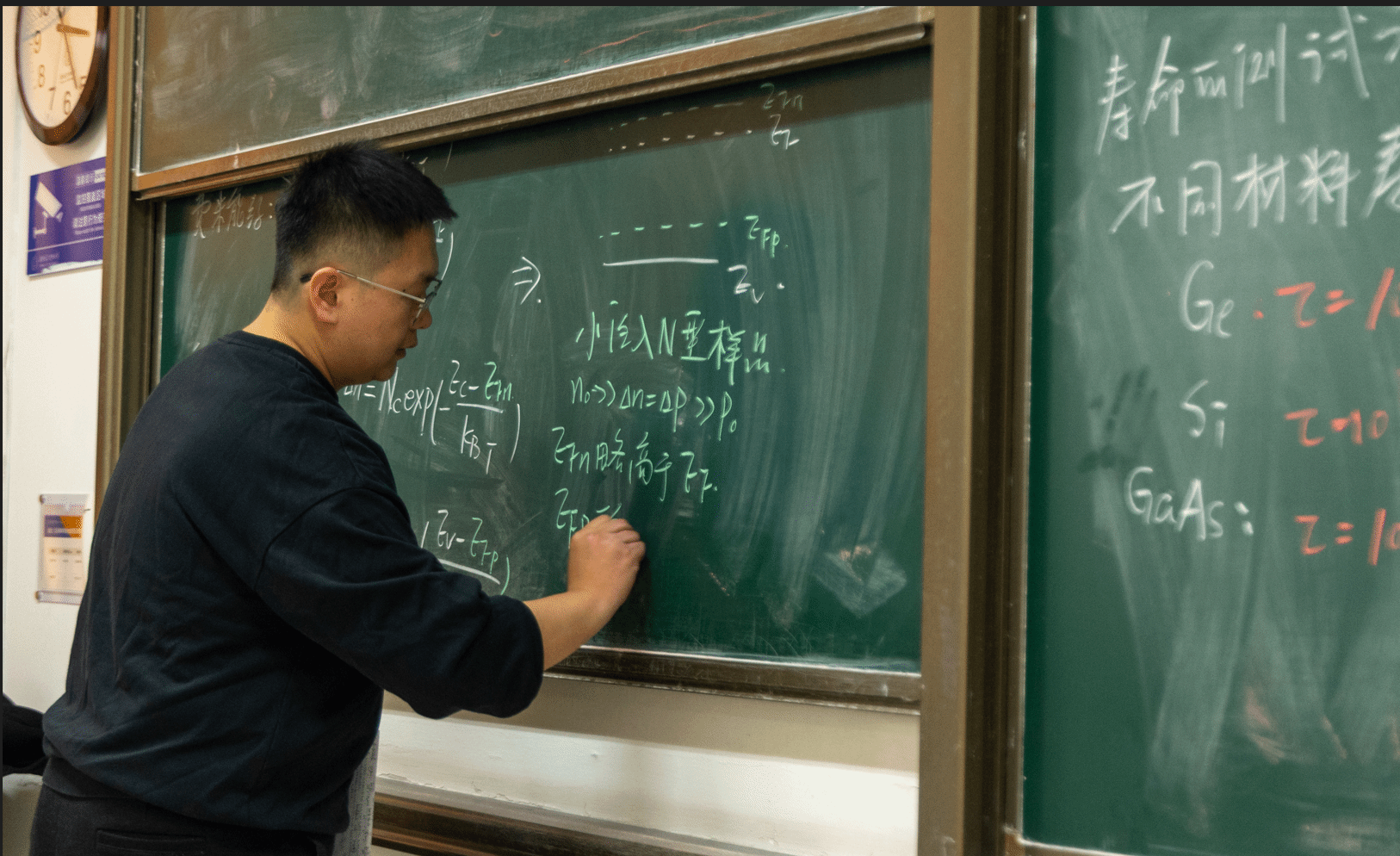 “作为一名教师,站稳讲台是首要任务。”为此,周龙一直向金沙娱乐城 的教学名师和前辈虚心求教,汲取教学经验和智慧。在担任助教期间,周龙参与了黄云霞老师省级精品课程《固体物理》的建设和学习,深刻体会到了教师站稳讲台的艰辛与不易。黄云霞老师认真负责的教学态度,以及“讲好课,育好人”的教学理念,深深地影响了他,成为他教学生涯中的宝贵财富。“目前,我主讲《固体物理》《半导体物理》《固体电子器件》课程,课程量不算多,因此每一次备课,我都会精心规划板书的内容,力求做到既简洁明了又生动有趣。” 在讲台上,周龙总是充满激情和活力,善用生动的例子和有趣的故事,来激发学生的学习兴趣和求知欲,让学生在学习过程中能够有所收获。课后,学生们也愿意主动找周老师请教问题,共同探讨学术难题。这种良好的师生关系不仅促进了学生的学习进步,也为学生今后的科研道路奠定了坚实的基础。