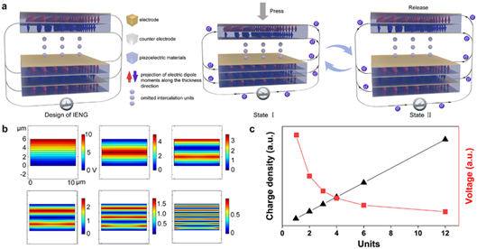 a,三维插层电极的基本结构及其工作原理。b,压电层内插层电极单元数分别为1、2、3、4、6和12时,压电势的分布。c,图b中不同情况下计算得到的输出电荷密度和输出电压。