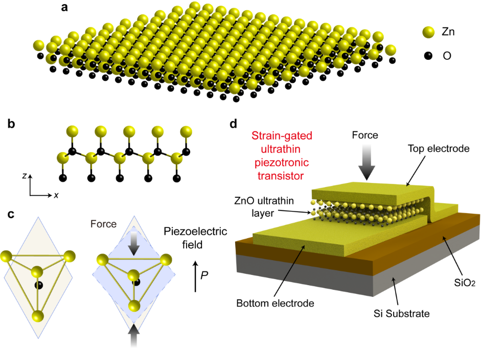 秦勇教授的共同指导下,王龙飞博士和博士生刘书海等研究成员通过深入研究二维超薄氧化锌面外压电特性,成功地制备出一种新型的、沟道只有~2 nm的超薄氧化锌压电电子学晶体管,并且,首次将压电电子学效应引入到二维超薄非层状压电半导体中。