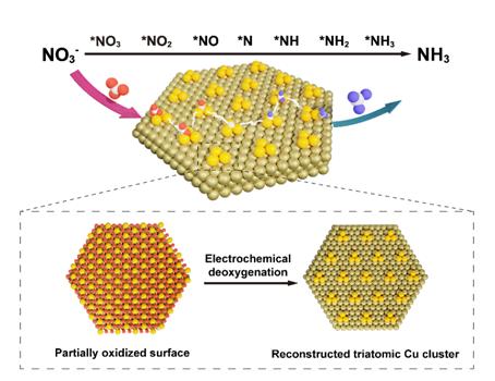 研究发现,Cu纳米片表面的氧化物组分在阴极极化过程会发生还原反应,形成周期性排列的Cu原子。理论计算发现,周期性的表面Cu原子不稳定,会发生表面重构形成稳定的由三个Cu原子组成的团簇,该团簇对硝酸根离子表现出更强的吸附性能。进一步的理论计算表明,硝酸根离子在三原子Cu团簇位点进行脱氧过程和加氢过程,形成最终产物氨,氨的产率高达2016 mgmg-1cath-1,其法拉第效率在-0.5 V vs RHE电位为81.1%。