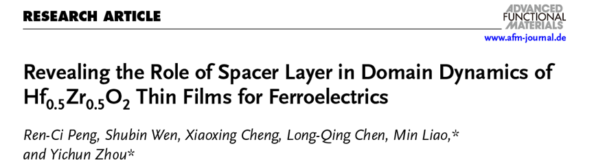 研究成果以揭示Hf0.5Zr0.5O2薄膜中隔离在铁电畴翻转动力学中的作用(Revealing the Role of Spacer Layer in Domain Dynamics of Hf0.5Zr0.5O2 Thin Films for Ferroelectrics)为题最近在线发表在材料领域著名学术期刊Advanced Functional Materials。金沙娱乐城 副教授彭仁赐、与博士生文树斌为论文共同第一作者,廖敏授与周益春教授为共同通讯作者,其他重要贡献者包括深圳大数据研究院研究科学家程晓行博士、美国宾夕法尼亚州立大学陈龙庆教授。研究工作受到国家自然科学基金委和陕西省自然基金支持。