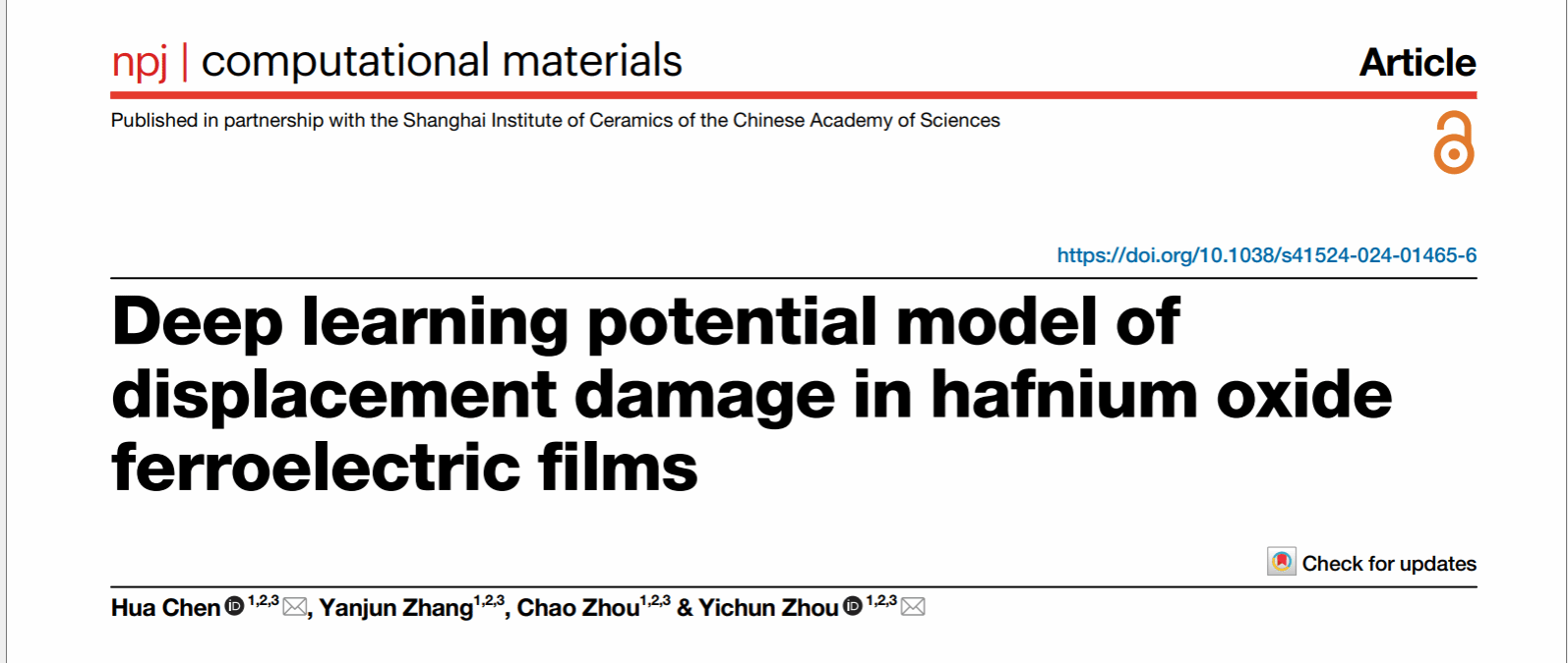 这一成果发表在一区期刊《npj Computational Materials》(影响因子:11.5)上,题为“A model for studying displacement damage in irradiated HfO2 ferroelectric thin films”。文章的第一通讯单位为金沙娱乐城 ,材料院研究生张彦军和副教授陈华共同提出了模型的建立方法,通讯作者为周益春教授和陈华副教授。