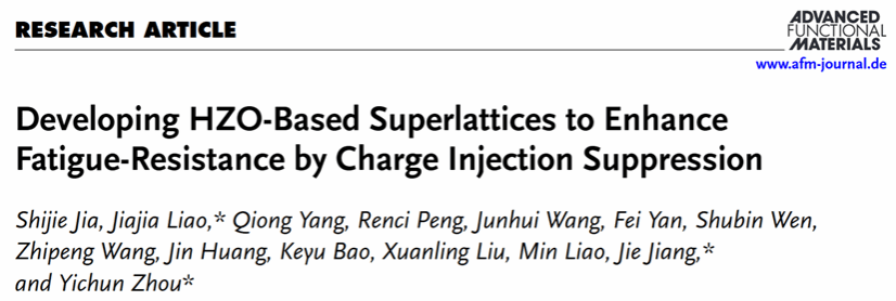 然而,在数据反复的写入和擦除过程中,HfO2基铁电存储器频繁出现的薄膜疲劳失效现象,已成为阻碍其大规模产业化应用的“拦路虎”。要攻克这一难题,实现高耐久性的铁电存储器,则必须深入探究铁电存储器件在信息擦写过程中铁电极化翻转的物理过程。其中,厘清极化翻转过程中漏电现象产生的物理机制,及其对击穿型疲劳失效造成的影响,显得尤为重要。如何建立微观极化翻转过程与宏观电学性能失效之间的关联,并大幅提升铁电薄膜材料的抗疲劳性能,是摆在科研人员面前的一项极具挑战性难题。近日,金沙娱乐城 周益春教授团队在这一研究领域取得重要进展。研究团队借助层状异质结构的Hf0.5Zr0.5O2-ZrO2超晶格设计,对微观极化翻转过程中的电荷注入现象与宏观疲劳失效之间的关联机理进行了深入剖析与阐释。基于此,成功制备出高耐久性(>1012次电场循环)铁电薄膜材料,并同时具备低矫顽场 (2Ec≈1.7 MV/cm)和快速极化翻转速度。这一成果为解决HfO2基铁电存储器疲劳失效问题奠定了理论基础,也为相关领域研究提供了新的解决思路。该研究成果以“Developing HZO-Based Superlattices to Enhance Fatigue-Resistance by Charge Injection Suppression” (DOI:10.1002/adfm.202501470)为题最近在线发表在国际材料领域著名学术期刊Advanced Functional Materials期刊上(2024年影响因子为18.5)。金沙娱乐城 博士生贾世杰、副教授廖佳佳为论文共同第一作者,周益春教授、廖佳佳副教授、姜杰副教授(湘潭大学)与为共同通讯作者,研究工作依托金沙娱乐城 、陕西省空天高电子轨道材料与防护技术重点实验室等平台,研究工作受到国家自然科学基金、国家重点研发计划等基金支持。