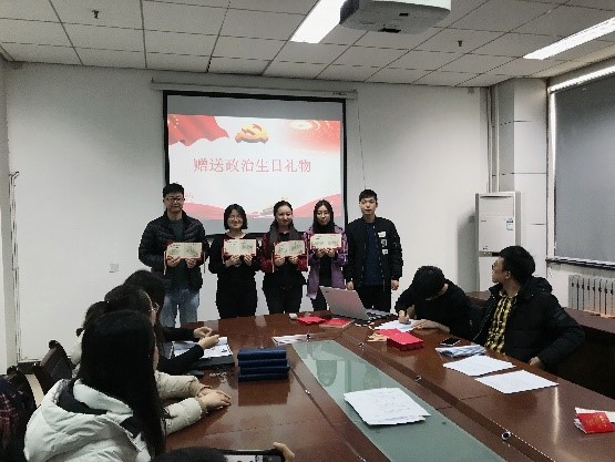 接着进行全体党员集体过“政治生日”主题党日活动,对于中国共产党员来说,有两个生日,一个是出生日,另一个特殊的生日就是“政治生日”。此次活动主要围绕给支部全体正式党员过“政治生日”展开。一是每位党员回顾自己的入党历程,各自表达对党的认识以及对党的情感;二是由党支部书记李鑫同志给各位党员过政治生日颁发生日贺卡及精美笔记本;同时,支部书记李鑫代表支委会向四名新接收的预备党员赠送了成为一名预备党员的生日礼物,同时勉励四位同志要发挥党员先锋模范作用,牢记自己的初心和使命,在今后的学习工作中不断创先争优,作好表率。三是全体党员一起重温了入党誓词。