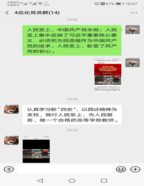 本科生代表陈晨激动的说:“很荣幸能在七一这个特殊的日子里学习这一节微党课。在看到了人大,复旦大学,北科大,西交大这几所高校在党组织的领导下取得了辉煌成就和感人故事后,我不禁反思起我作为一名大学生党员,如何才能向视频里那些与我同龄的优秀党员靠拢。我认为我要向这些优秀党员学习他们对党和人民矢志不渝的忠诚,始终肩负中华民族伟大复兴的责任,扎根科研不断创新的动力,舍小我为大我的可贵精神。我们党迎来了自己99周岁华诞,我作为一名党员,有责任有义务为这个有些光荣历史并依然朝气蓬勃的政党贡献自己的力量!”