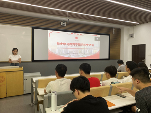 接着,李逸君代表支委班子报告了支部党史学习教育开展情况,指出了支部党史学习教育中存在的问题。半年来,支部围绕“学史明理、学史增信、学史崇德、学史力行”四个专题,对照“学党史、悟思想、办实事、开新局”的目标,支部举办了十余项形式多样、内容丰富的党史学习教育活动,包括“一百天•忆百年”栏目文稿撰写、“以答促学”——每日在线答题、“讲学唱”红歌会、红色经典朗读会、“办实事•开新局”实践月等,集中学习了8次党课,包括全国大学生“同上‘四史’思政大课”、庆祝建党百年高校示范微党课、刘建伟教授党史学习教育专题报告、“支部书记讲党课”、“支部党员讲党课”等。常态化的党史学习教育对同志们坚定理想信念、增强历史自觉、弘扬优良传统、加强党性修养、发挥党员先锋模范作用、立足岗位为群众办实事发挥了巨大的导向作用。