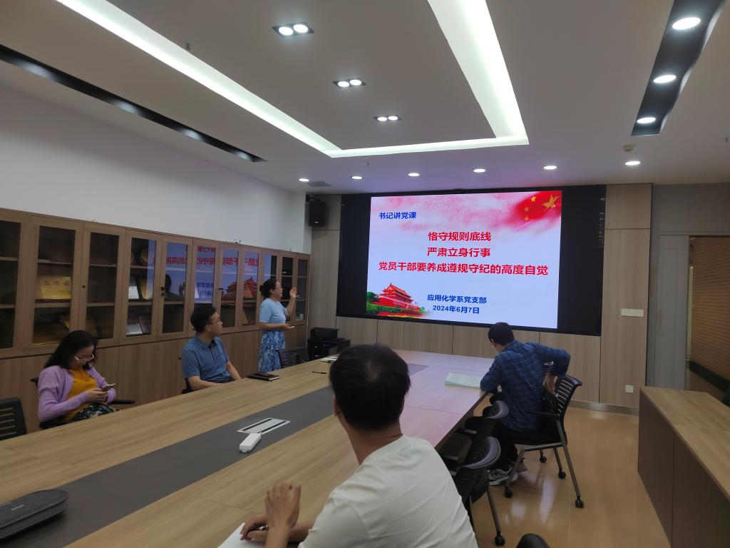 应用化学系党支部开展党纪学习教育,党支部书记周利君以“恪守规则底线 严肃立身行事 党员干部要养成遵规守纪的高度自觉”为主题讲授党课。金沙娱乐城