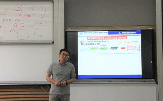 最后,青年教师李聪进行了“钙钛矿太阳电池中的结晶调控与缺陷钝化”的报告。李老师总结了其团队在钙钛矿结晶调控与高质量钙钛矿薄膜制备、以醋酸铅为铅源的钙钛矿太阳能电池以及缺陷钝化改善器件性能等方面的研究进展。报告中,李老师还分享了自己在读博期间的科研经历,鼓励在场的学生要勤奋刻苦,甘于坐冷板凳。