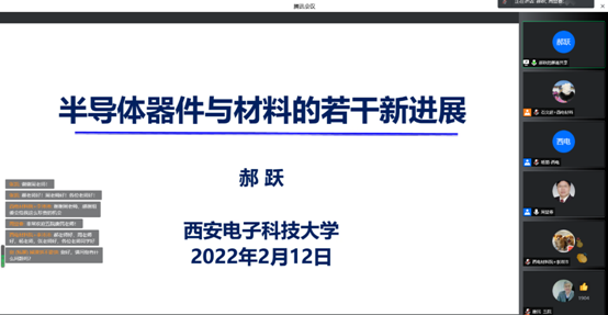 郝跃院士从“宽禁带与超宽禁带半导体材料与器件”、“微纳米半导体新器件、新结构和先导技术”两个方面阐述了团队科学研究的最新成果,并对氮化镓基和氧化镓基器件进行了详细的讲述和介绍。报告内容详实,师生就半导体器件和集成电路的相关问题积极提问,郝院士都一一进行了耐心解答,线上讨论热烈,师生收获颇丰。郝院士的报告在参会人满屏的鼓掌和点赞中完美结束。