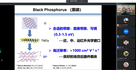 张凯研究员为大家带来的报告题目为《窄带隙二维材料与器件》。他指出窄带隙半导体及器件在国防安全等领域发挥着重要作用,随着CMOS兼容集成的趋势及宽光谱、室温工作等性能突破的需要,窄带隙二维材料的研究为高性能红外、太赫兹光电子器件的发展带来了契机。张研究员以黑磷薄膜的设计制备及其在太赫兹探测与红外激光器的应用探索为例,详细讲述了其团队在新型窄带隙二维材料领域中获得的科研进展。