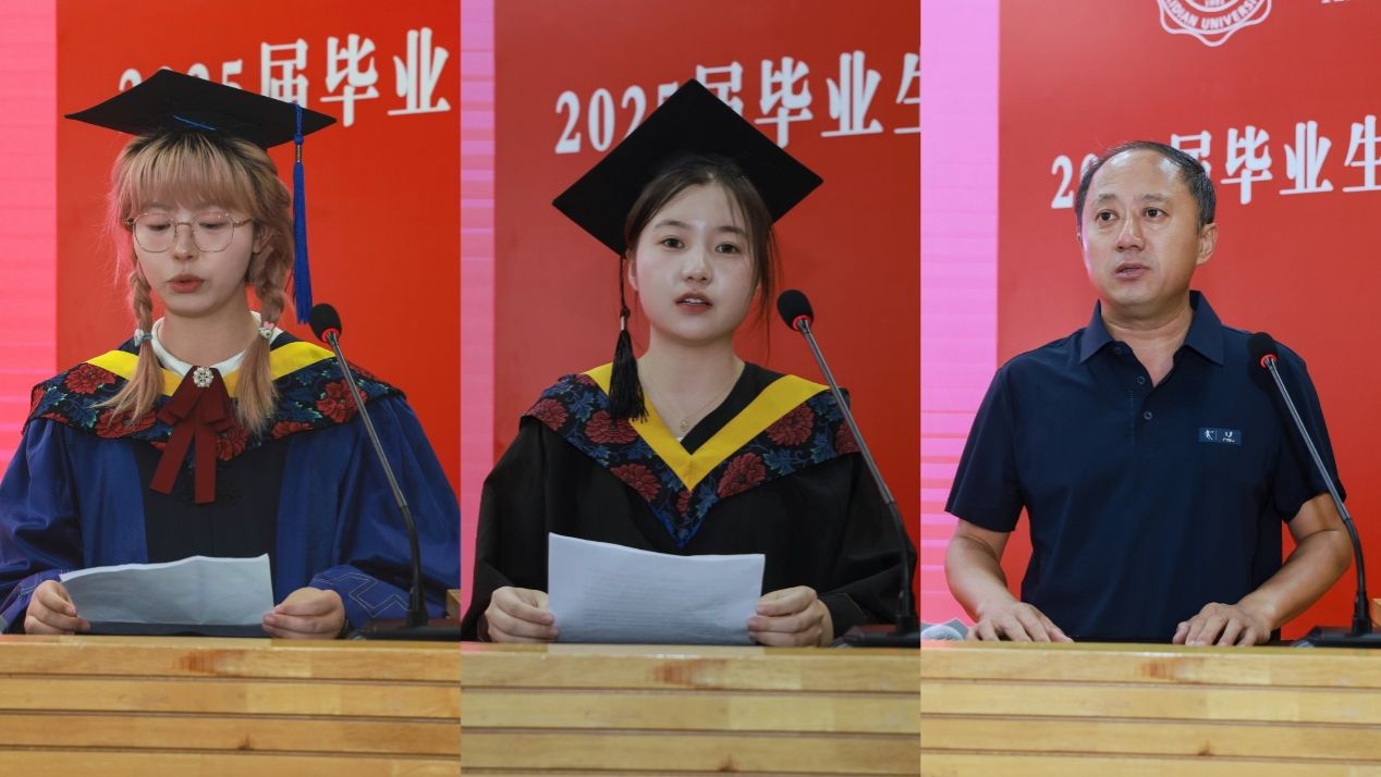 研究生代表谯云以实验室的晨光与论文录用的泪水串联三年求学时光,感恩金沙娱乐城 以红色基因铸魂,以科研平台育才,承诺将带着金沙娱乐城精神奔赴科技报国战场。本科生代表朱志伟生动回忆樱花大道打卡、期末图书馆抢座的校园点滴,笑称“B楼迷宫终成青春坐标,并深情告白师长:您搭建的知识桥梁,是我们走向世界的底气。”