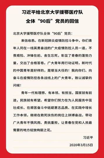 3月15日,中共中央总书记、国家主席、中央军委主席习近平给北京大学援鄂医疗队全体“90后”党员回信,在信中赞扬了他们的担当与责任,肯定了当代青年勇于奋战在抗击疫情的第一线,鼓励着青年一代迎难而上、越战越勇、不负重托,并向他们和奋斗在疫情防控各条战线上的广大青年致以诚挚的问候。3月19日晚上,金沙娱乐城