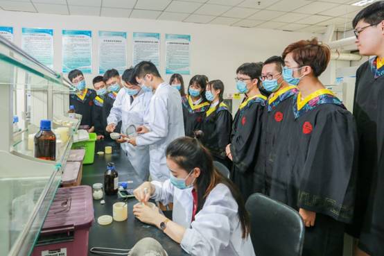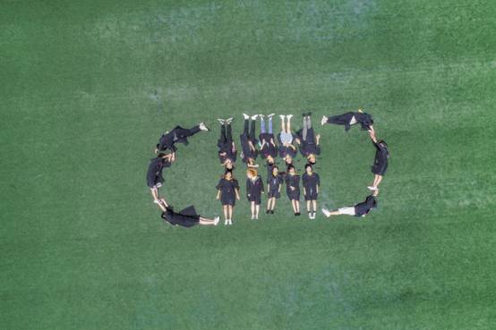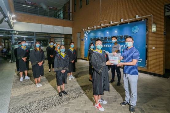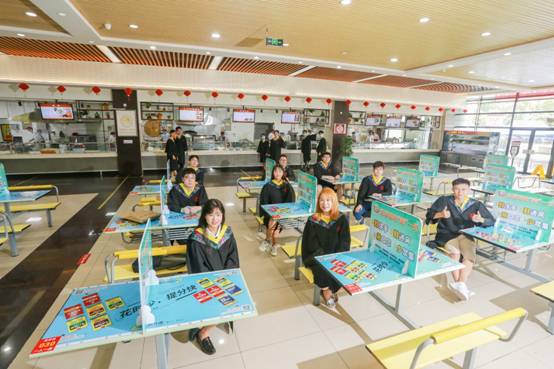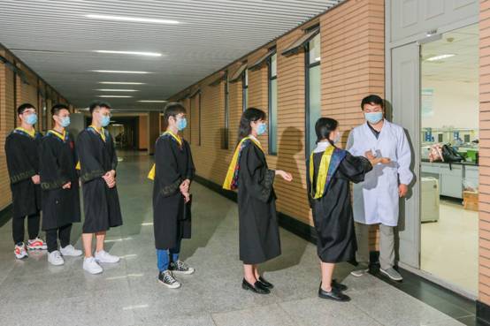 29日一大早,17名同学早早换上学士服,兴奋地等待摄影师的到来。从早上8点半开始,一直到13点30分,大家戴着口罩,分别模拟了学生返校时大门口扫码测温、进宿舍测温、在餐厅用餐、进实验室等场景,十几人还在操场摆出“口罩”的图案,纪念这个特殊的毕业季。