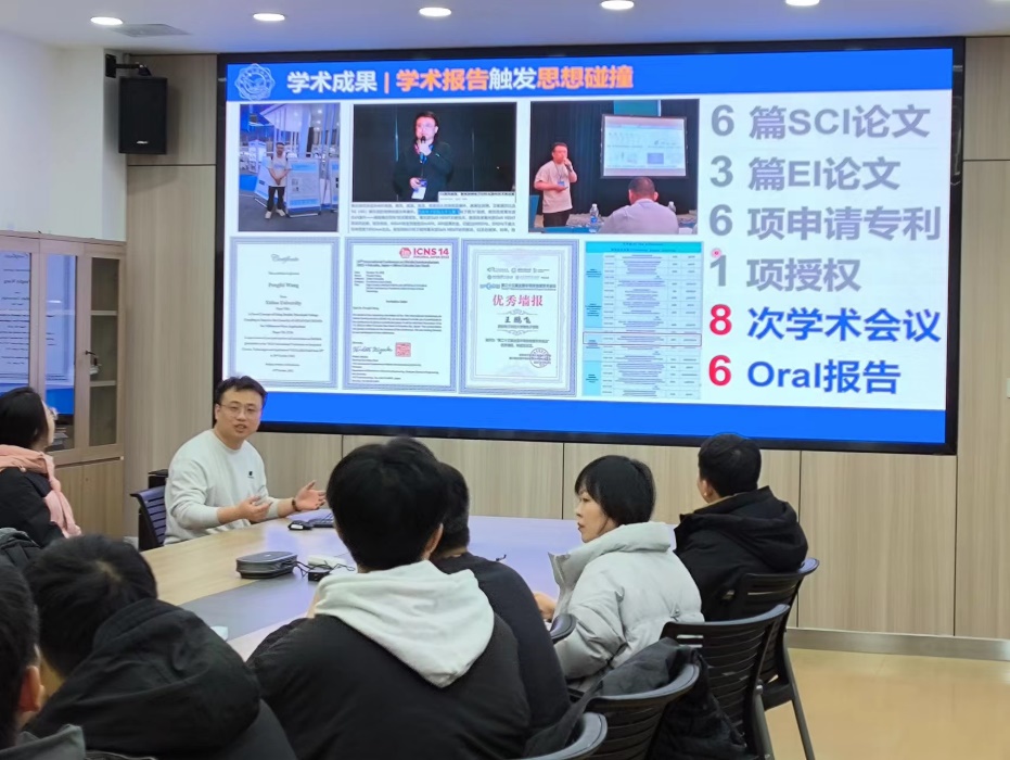 2020级春季博士,他分享了自己从了解、探索再到逐步深入所研究课题的经历,向同学们讲述了扎实的理论基础及广泛阅读文献的重要性,他强调只要找准方向、一以贯之,就一定能有所收获。随后,王鹏飞从科研起步阶段、研究方向的确定、思维体系的培养、科研过程中心态的调节、论文写作技巧以及科研过程中可能遇到的一些问题等方面进行了细致的分享。最后,王鹏飞感谢课题组老师的敦敦教诲及师弟师妹们的无私帮助,他号召同学们在完成自己的科研任务之余,也应当积极承担好自己的责任,力所能及地分享和传授科研学习经验,做好传帮带育人工作。