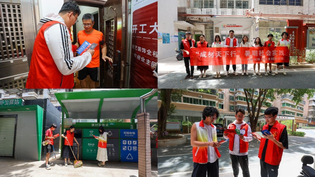 “材行天下”实践团,积极加入广东青年大学生“百千万工程”突击队,来到广州市天河区天园街东成社区开展“垃圾分类伴我行”的社区实践。同学们兵分多路走进社区各个角落,利用所学的材料、化学专业知识,以通俗易懂的语言和详细讲解、互动问答、现场演示的方式向居民们传递垃圾分类的益处和操作方法。此外,他们还前往社区垃圾站点指导居民正确区分可回收物、有害垃圾、湿垃圾和干垃圾,确保每一类垃圾都能得到妥善处理。往来的居民纷纷向同学们竖起了大拇指,并说此举改善了夏天社区垃圾站虫蝇乱飞、污水四溢、臭气熏天、污染环境的现象,并对他们奉献、友爱、互助、进步的垃圾分类指导活动给予了充分的肯定和感谢。