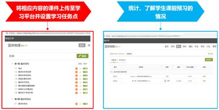 线上资源是开展混合式教学的前提。黄老师在开课前期,在学习平台构建了《固体物理基础》课程网站,上传教学大纲,使学生提前了解该门课程的教学目标和任务、学习内容、学习重点和难点以及课程的考核方式。同时建立课程章节,并根据授课内容和进度上传相应的教学课件和视频资源,并在课前将所讲内容的课件及相关视频上传至学习平台,让学生提前进行预习,给予学生充分的独立学习和理解的时间,尽可能让每个学生都带着较好的知识基础进入线上课堂,从而很好地保障了课堂教学的质量。此外,黄老师通过设置学习任务点,统计、了解学生的预习情况,进而督促学生进行课前的学习,从而为实现课前、课中、课后无缝连接打造良好的基础。
