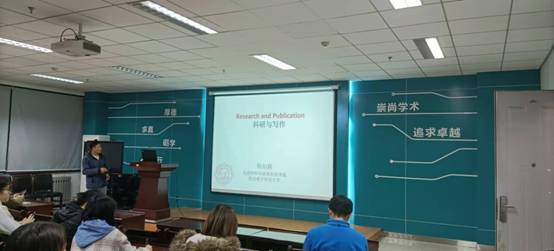 当谈及如何撰写文章的时候,杨老师以“闲看门中月,思耕心上田”为核心思路,讲述了文章的层次,文章发表的流程,以及发表高水平文章的方法。他强调发文章首先重要的就是思路,一个良好的思路会让实验的进程大大加快,另一个重要的方面是良好的实验结果应该通过良好的表述呈现出来。杨老师给大家传授了许多撰写论文的小技巧,例如多写短句、多用合理的单词等,同时给大家介绍了一些材料方向的期刊,并鼓励大家积极向国内期刊投稿。杨老师深入浅出的讲解,引得学生们发出一阵阵热烈的掌声。